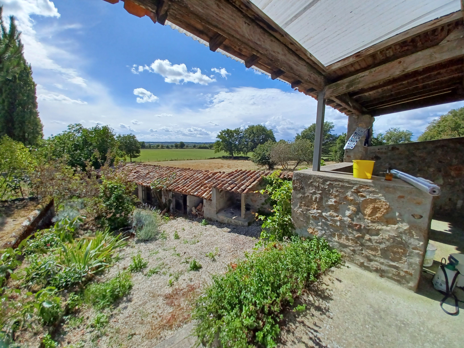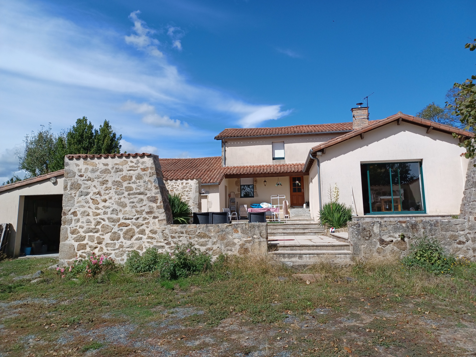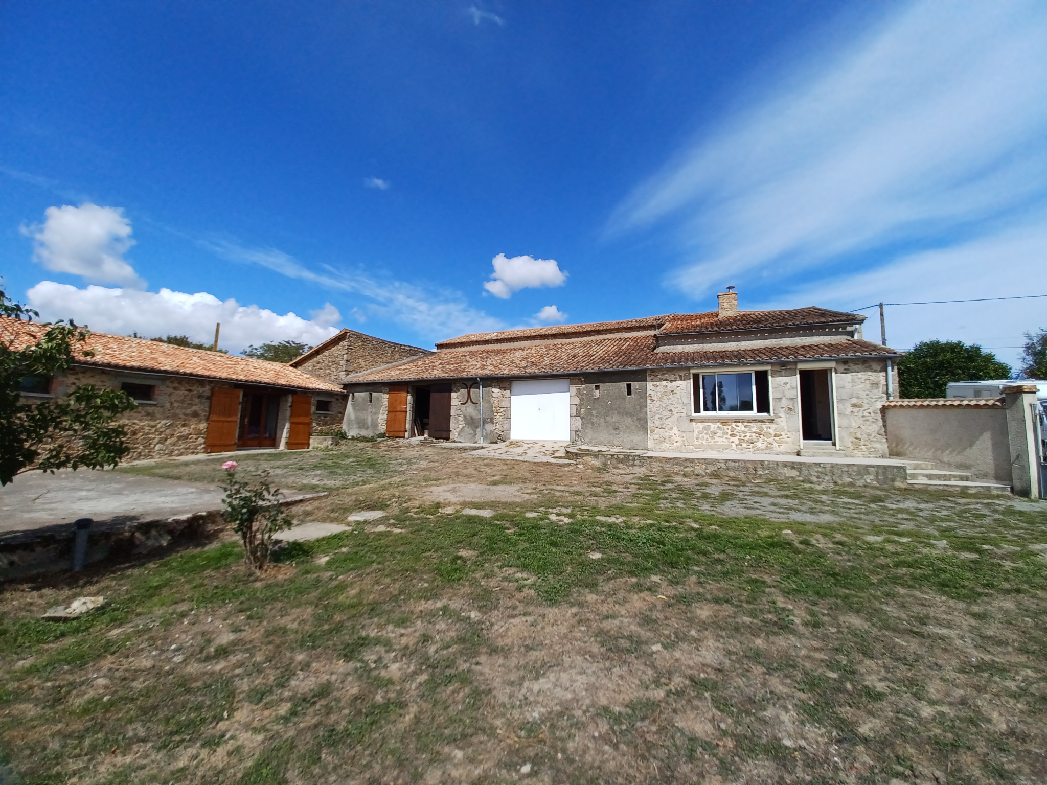 La troisième partie, à renover, se compose d'une pièce à vivre avec insert, d'une salle d'eau avec WC et de deux box utilisés comme chambres. Une terrasse sous préau orientée plein sud, un grand terrain arboré, une partie piscinable. À cela s'ajoute un cellier de 20 m² et deux granges sur sol béton.