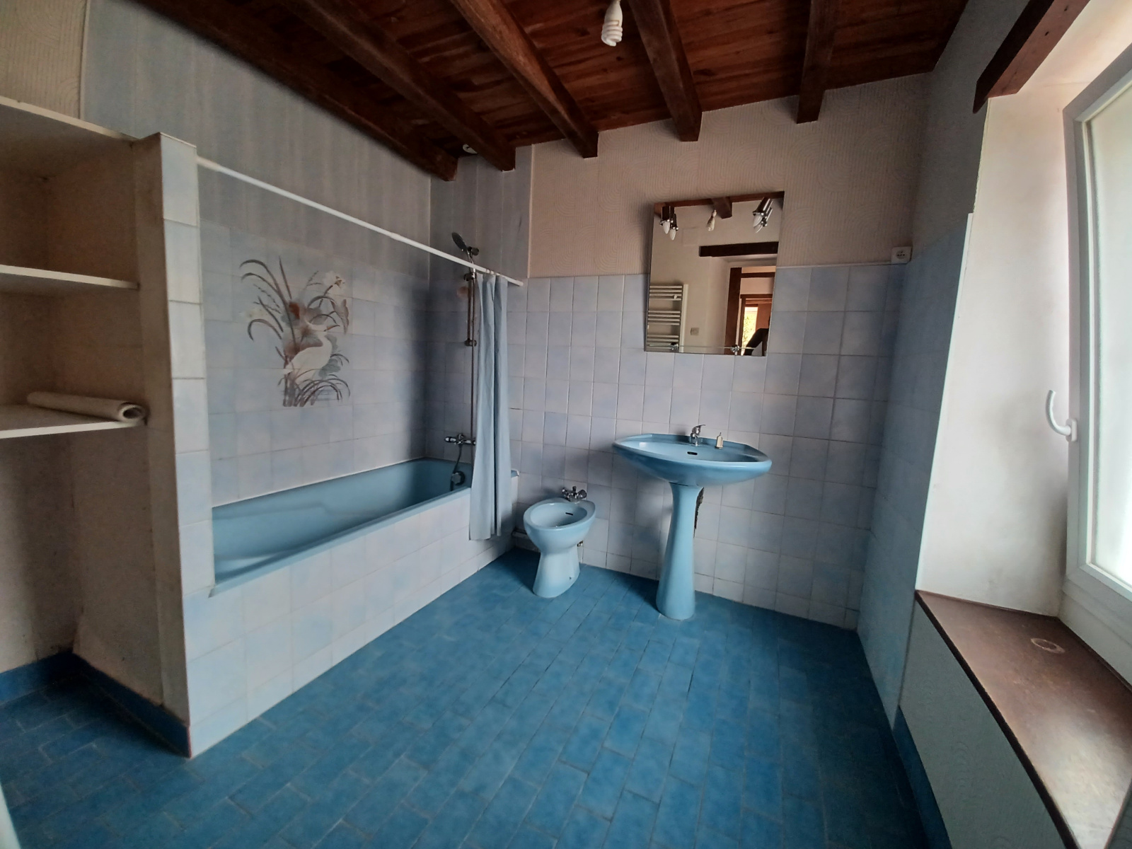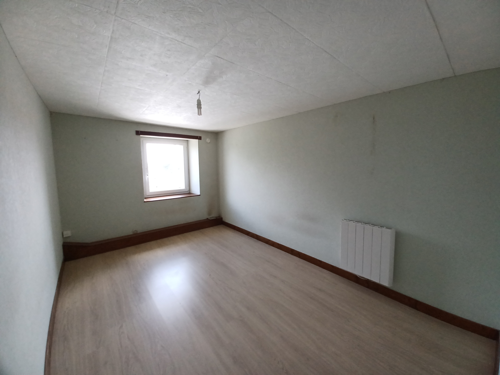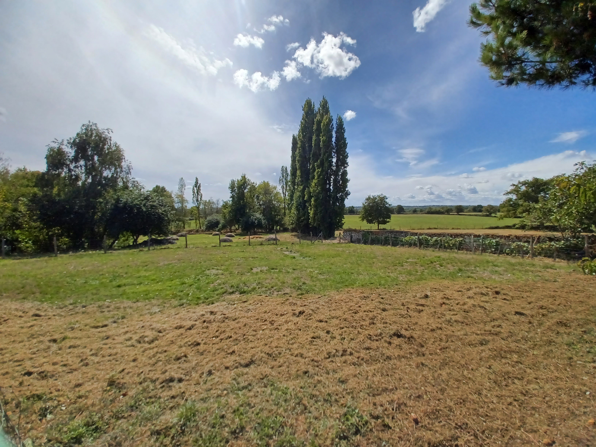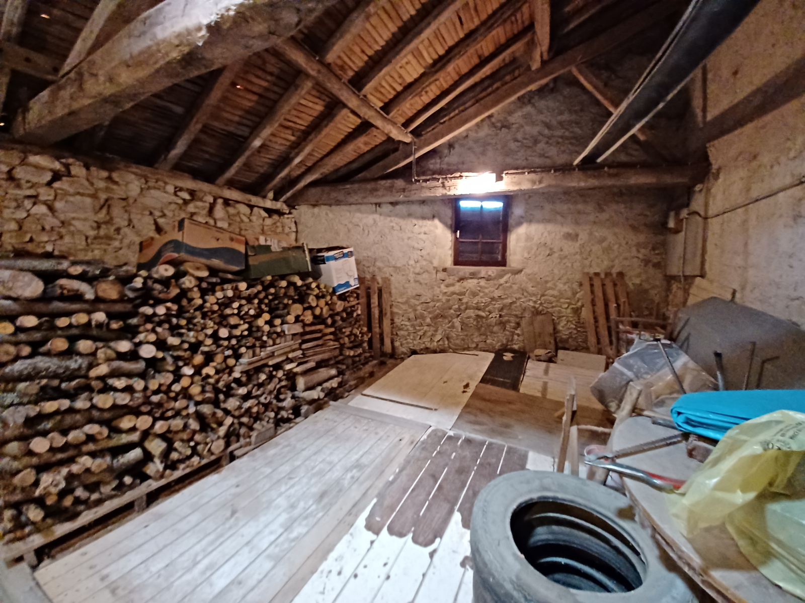 La troisième partie, à renover, se compose d'une pièce à vivre avec insert, d'une salle d'eau avec WC et de deux box utilisés comme chambres. Une terrasse sous préau orientée plein sud, un grand terrain arboré, une partie piscinable. À cela s'ajoute un cellier de 20 m² et deux granges sur sol béton.
